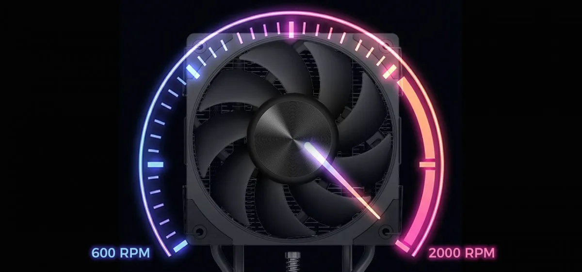 Wentylator PWM w rozmiarze 120 mm, pracuje w zakresie prędkości obrotowej od 600 (+-100) do 2000 (+-10%) RPM. Prędkość ustawić można na krzywej obrotów wentylatora, dlatego zakres chłodzenia jest już w Twoich rękach.