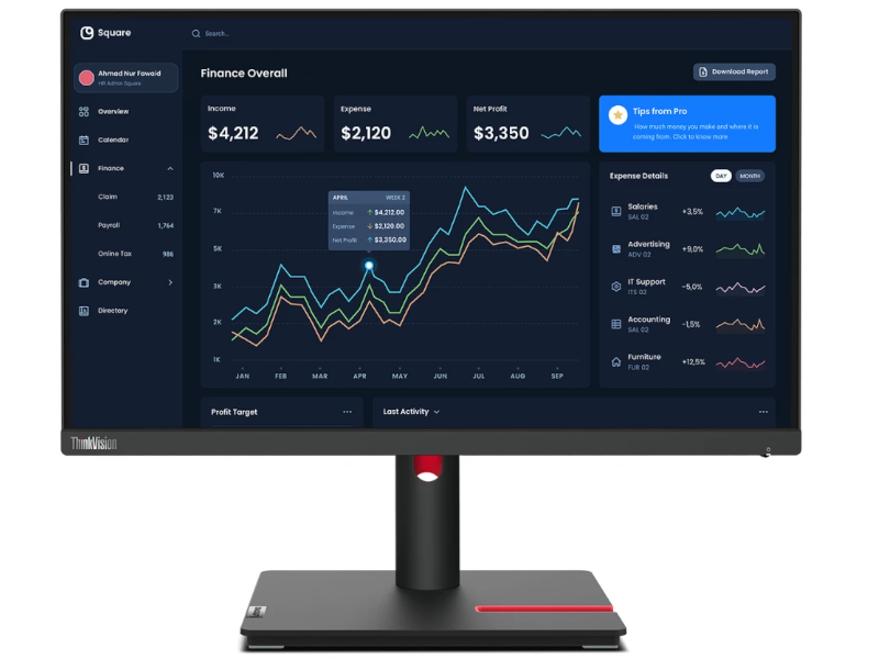 Dostosuj monitor do swoich potrzeb. Dzięki regulacji położenia monitora możesz wybrać czy potrzebujesz, aby znajdował się on w pozycji poziomej, czy też Twoja praca wymaga pionowego położenia. Dodatkowo Lenovo ThinkVision posiada możliwość regulacji wysokości oraz kąta odchylenia i kąta obrotu. Teraz będziesz mógł pracować tak, jak tego potrzebujesz.