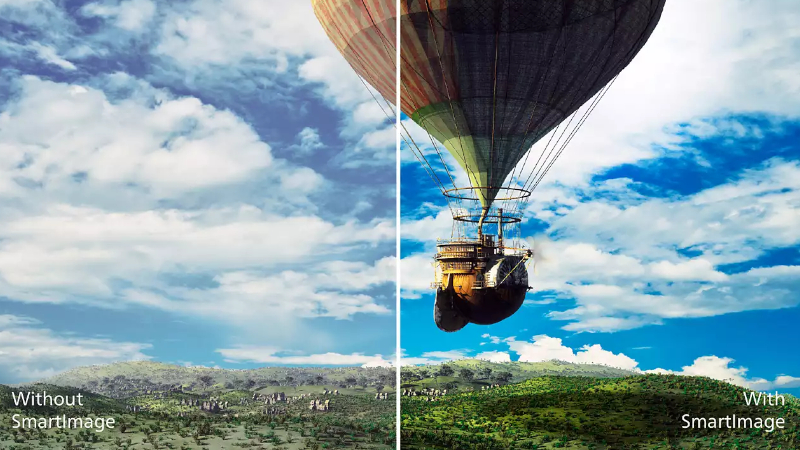 SmartImage to najnowsza, ekskluzywna technologia firmy Philips, która analizuje zawartość wyświetlaną na ekranie i zapewnia zoptymalizowaną wydajność wyświetlacza. Ten przyjazny dla użytkownika interfejs umożliwia wybór różnych trybów, takich jak: Biuro, Zdjęcia, Filmy, Gry, Oszczędność itd. w celu dopasowania używanej aplikacji. W oparciu o ten wybór technologia SmartImage dynamicznie optymalizuje kontrast, nasycenie kolorów i ostrość zdjęć i filmów w celu zapewnienia najlepszej wydajności wyświetlacza. Tryb Oszczędność pozwala oszczędzić energię. A wszystko to w czasie rzeczywistym za naciśnięciem jednego przycisku!