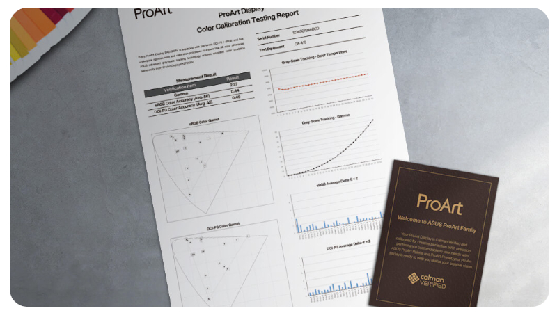 Każdy monitor ProArt jest fabrycznie precyzyjnie skalibrowany w nowym, trzystopniowym procesie, który zapewnia wiodącą w branży wierność kolorów. Następnie poddawany jest rygorystycznym testom z wykorzystaniem zaawansowanej technologii śledzenia skali szarości ASUS, co gwarantuje płynniejsze przejścia tonalne, lepszą jednorodność obrazu i najwyższą dokładność kolorystyczną z różnicą Delta E < 2. Dzięki certyfikatowi Calman Verified oraz drobiazgowym testom każdy PA24ACRV staje się niezawodnym narzędziem dla profesjonalistów, którzy oczekują absolutnej pewności, że ich projekty będą prezentować się dokładnie tak, jak zostały zaplanowane.