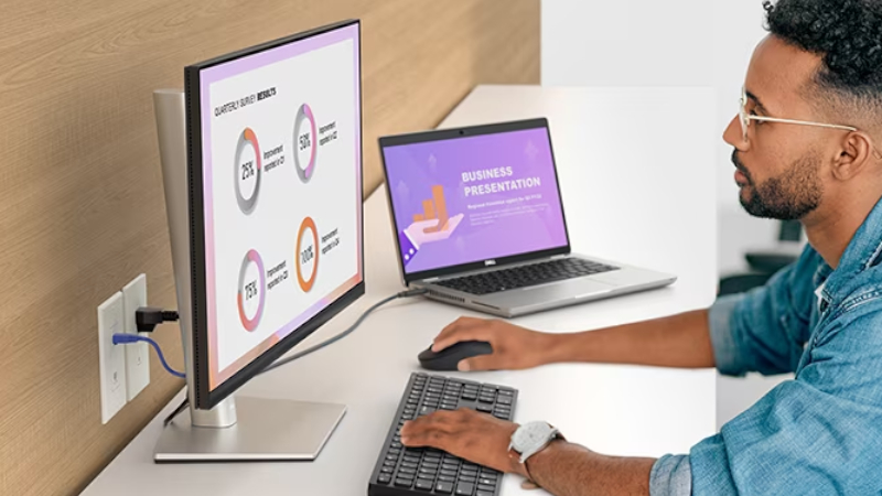 Monitor Dell P2422HE posiada ergonomiczną konstrukcję i wąskie ramki, dzięki czemu pomieszczą więcej treści na ekranie. jest to szczególnie istotne dla szybkości i wygody pracy, zwłaszczy gdy operujesz na dużej iloścy danych, dzięki czemu nawet wielogodzinna praca przed ekranem monitora nie męczy Twojego wzroku. Dodatkowo, duża przestrzeń robocza umożliwi Ci omawiać prezentacje oraz różne zagadnienia biznesowe, bez konieczności używania rzutnika.