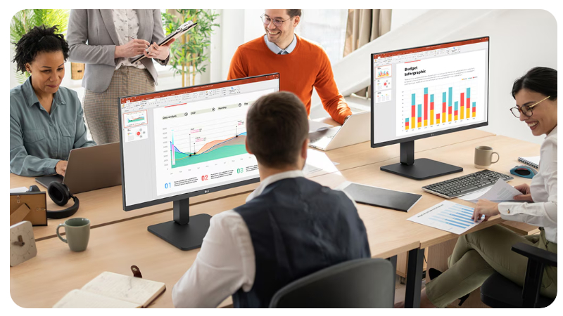 Monitor LG 24BA550-B.AEUQ to nie tylko sprzęt dla graczy – jego odświeżanie 100 Hz świetnie sprawdza się także w codziennej pracy. Wyższa częstotliwość odświeżania zapewnia płynne wczytywanie programów i przewijanie treści, minimalizując efekt zacinania oraz rozmycia ruchu. Dzięki temu praca staje się bardziej komfortowa i efektywna – niezależnie od tego, czy edytujesz dokumenty, korzystasz z wielu aplikacji jednocześnie, czy po prostu przeglądasz internet. To idealne połączenie produktywności i wygody w jednym monitorze.
