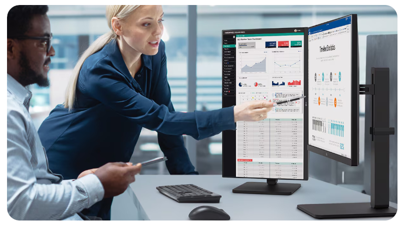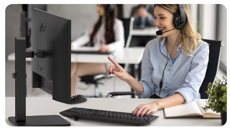Monitor LG 24BA560 został zaprojektowany z myślą o maksymalnym komforcie podczas wielogodzinnej pracy przy biurku. Dzięki szerokim możliwościom regulacji – nachylenia, skrętu, obrotu oraz wysokości – z łatwością dostosujesz jego ustawienia do swoich indywidualnych potrzeb. Niezależnie od tego, czy pracujesz nad dokumentami, analizujesz dane, czy prowadzisz wideokonferencje, możesz stworzyć ergonomiczne stanowisko pracy, które minimalizuje zmęczenie i sprzyja koncentracji. Co więcej, funkcjonalna podstawa monitora wspiera komunikację i współpracę – możliwość obrotu i regulacji wysokości sprawia, że łatwo podzielisz się ekranem z klientami lub współpracownikami, prezentując treści w najbardziej komfortowy sposób.