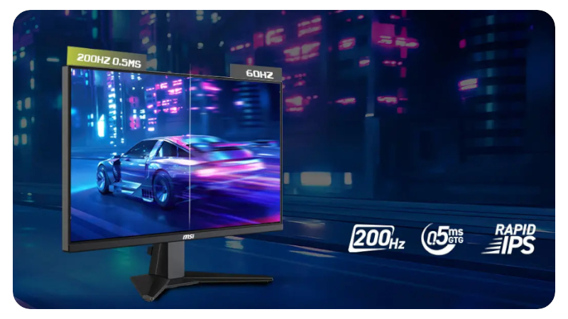 Gamingowy monitor MSI MAG 244F z matrycą Rapid IPS charakteryzuje się częstotliwością odświeżania wynoszącą 200 Hz oraz 0,5-milisekundowym czasem odpowiedzi matrycy. Dzięki tym parametrom może zaoferować istotne korzyści w grach, które zawierają szybkie, dynamiczne sceny, a więc w tytułach z gatunku FPS (First Person Shooter), wszelkiego rodzaju „bijatykach”, symulacjach wyścigów samochodowych, strategiach czasu rzeczywistego czy w grach sportowych. Gry te wymagają odwzorowania bardzo szybkich i precyzyjnych ruchów na ekranie, które to zapewnić może jedynie wyjątkowo wysoka częstotliwość odświeżania ekranu oraz niski czas reakcji matrycy monitora. To właśnie dzięki nim gracz może podczas rozgrywki z łatwością pokonać swoich przeciwników.