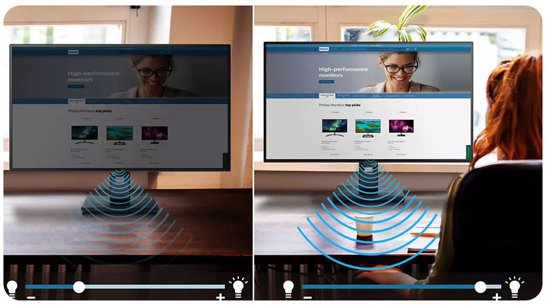 Dzięki zaawansowanym technologiom PowerSensor i LightSensor monitor sam dba o komfort pracy i oszczędność energii. PowerSensor pełni rolę inteligentnego „czujnika ludzi” — nadaje i odbiera nieszkodliwe sygnały podczerwieni, aby wykryć obecność użytkownika. Gdy odchodzisz od biurka, automatycznie przyciemnia ekran, redukując zużycie energii nawet o 70% i jednocześnie wydłużając żywotność monitora. LightSensor z kolei analizuje oświetlenie w pomieszczeniu i na bieżąco dostosowuje jasność obrazu, zapewniając idealny balans między jakością wyświetlania a energooszczędnością. To inteligentny duet technologii, który zapewnia komfortowe warunki pracy, perfekcyjny obraz oraz realne oszczędności — całkowicie bezobsługowo.