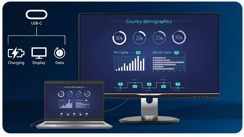 Monitor Philips 243B1/00 ma wbudowane złącze USB typu C z funkcją zasilania. Dzięki inteligentnemu i elastycznemu zarządzaniu zasilaniem możesz bezpośrednio ładować zgodne urządzenie. Smukłe, dwustronne złącze USB-C umożliwia łatwe podłączenie urządzeń z użyciem jednego przewodu. Możesz oglądać filmy wideo o wysokiej rozdzielczości oraz szybko przesyłać dane i jednocześnie zasilać lub ładować zgodne urządzenie.