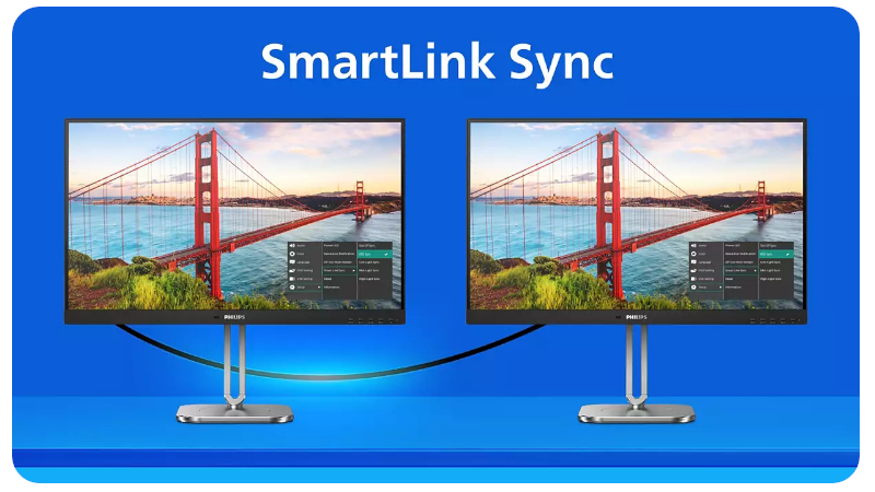Ustawienia jasności i kolory są automatyczne synchronizowane, gdy monitor ten jest używany w konfiguracji łańcuchowej jako dodatkowy monitor podłączony do monitora głównego, który obsługuje funkcję Smart Link Sync. Niezależnie od tego, czy projektujesz, prowadzisz prezentację, czy wykonujesz wiele zadań jednocześnie, korzystaj z płynnej spójności wizualnej na wszystkich ekranach. Wybierz tryb OSD Sync lub Light Sync (poziom niski, średni lub wysoki) dla głównego monitora, aby dopasować jego wyświetlacz do otoczenia.