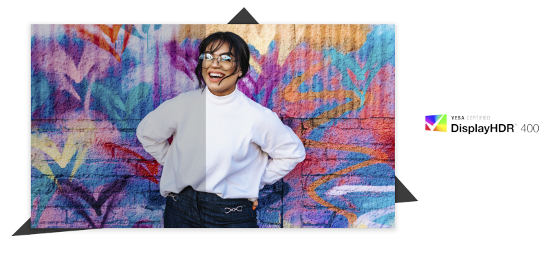 Nawet najniższy poziom funkcji High Dynamic Range (HDR) oferuje znaczną poprawę obrazu na monitorze. Szczytowa wartość luminancji wynosząca 400 cd/m² pozwala ekranowi na poprawę jakości obrazu dzięki uzyskaniu szerszego spektrum barw i większemu zróżnicowaniu kontrastu. Certyfikat VESA gwarantuje bogactwo szczegółów i realistyczne wyświetlanie gier oraz filmów.