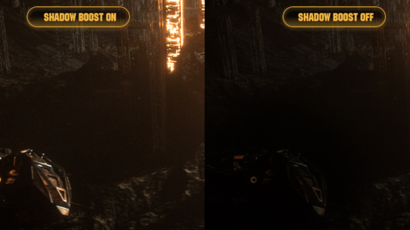 Technologia ASUS Shadow Boost rozjaśnia ciemne obszary w grze bez nadmiernego naświetlania jasnych stref. Nie tylko poprawia to ogólne wrażenia podczas oglądania, ale również ułatwia dostrzeganie wrogów ukrywających się w ciemnych częściach mapy.
