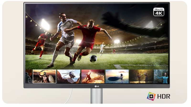 Monitor LG UHD 4K HDR 27UP650K przenosi Twoje wrażenia wizualne na zupełnie nowy poziom. Dzięki zaawansowanej technologii przetwarzania obrazu potrafi przekształcić standardowe treści w materiały o jakości zbliżonej do HDR, poprawiając odwzorowanie tonów i jasności, by każdy detal był jeszcze bardziej realistyczny. Zanurz się w niezwykle szczegółowym świecie 4K, gdzie kolory nabierają głębi, a kontrast zachwyca naturalnością.