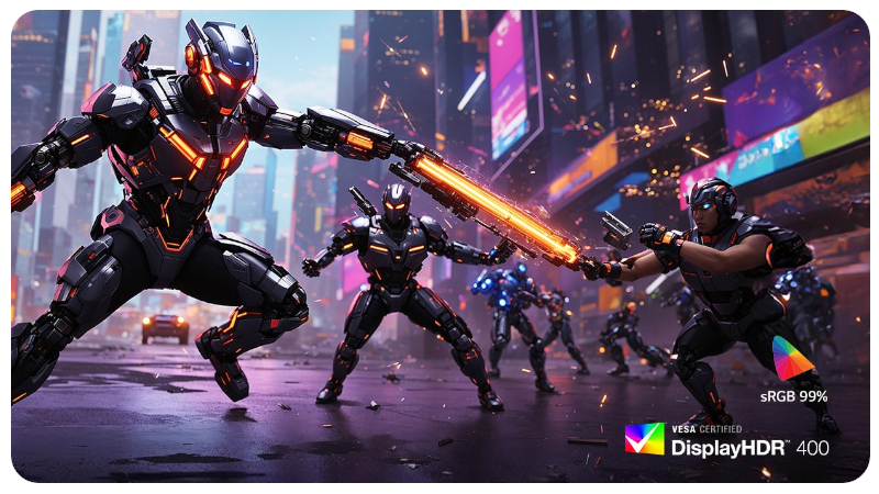 Monitor gamingowy LG UltraGear 27G610A-B oferuje szerokie spektrum kolorów z pokryciem 99% sRGB (typ.), zapewniając wyjątkową wierność barw i naturalne odwzorowanie detali. Obsługa standardu VESA DisplayHDR™ 400 pozwala uzyskać wyższy poziom kontrastu i jasności, dzięki czemu obraz staje się bardziej dynamiczny, realistyczny i pełen głębi. Każda scena zachwyca intensywnością kolorów i precyzją, przenosząc rozgrywkę na nowy poziom immersji. LG UltraGear 27G610A-B to idealny wybór dla graczy, którzy oczekują nie tylko płynności, ale również doskonałej jakości obrazu zgodnej z wizją twórców gier.