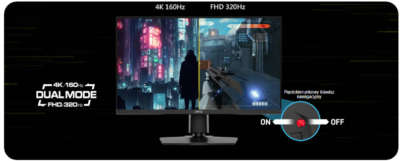 Funkcja Dual Mode umożliwia wybór rozdzielczości i częstotliwości odświeżania najlepiej dopasowanych do Twojej gry. Wybierz niższą rozdzielczość, ale wyższą częstotliwość odświeżania, aby grać w dynamiczną strzelankę pierwszoosobową, lub ciesz się ostrym obrazem 4K przy niższej częstotliwości odświeżania. Projekt jest zorientowany na użytkownika i kładzie nacisk na ergonomię i wygodę. Po prawej stronie ekranu znajduje się pięciowymiarowy klawisz nawigacyjny, który umożliwia łatwe przełączanie się między dwoma trybami, zapewniając tym samym bezproblemowe i przyjazne korzystanie z urządzenia.