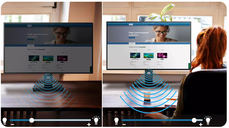 Nowoczesna technologia PowerSensor sprawia, że monitor sam zadba o oszczędność energii — bez żadnego wysiłku z Twojej strony. Działa niczym inteligentny „czujnik obecności”, emitując i odbierając bezpieczne sygnały podczerwieni, aby wykryć, czy użytkownik znajduje się przy biurku. Gdy odejdziesz, ekran automatycznie przyciemni jasność, redukując zużycie energii nawet o 70% i jednocześnie wydłużając żywotność urządzenia. To sprytne, ekologiczne i wyjątkowo praktyczne rozwiązanie. Technologia LightSensor idzie o krok dalej, dbając o optymalną jakość obrazu przez cały dzień. Inteligentny czujnik monitoruje poziom oświetlenia w pomieszczeniu i automatycznie dostosowuje jasność ekranu, aby zawsze zapewniać idealny, komfortowy obraz przy możliwie najniższym poborze energii. Razem tworzą duet, który łączy wygodę, ekologiczność i inteligentne działanie — bo dobry monitor potrafi myśleć za Ciebie.