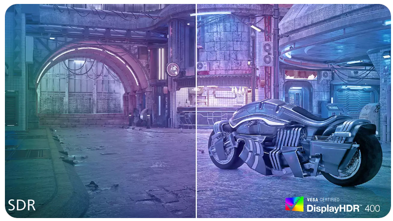Certyfikat VESA DisplayHDR 400 to technologia gwarantująca zupełnie nową jakość oglądania w porównaniu ze standardowymi monitorami SDR. W odróżnieniu od innych monitorów „zgodnych z technologią HDR”, prawdziwe wyświetlacze z certyfikatem DisplayHDR 400 zapewniają zadziwiającą jasność, niezrównany kontrast i zniewalające kolory. Dzięki funkcji globalnego przyciemniania i minimalnej jasności sięgającej 400 nitów obraz ożywa — jasne kolory są o wiele jaśniejsze, a ciemne jeszcze głębsze i bardziej zniuansowane. Pełniejsza paleta nowych, żywych barw sprawia, że oglądanie staje się inspirującym przeżyciem angażującym zmysły.