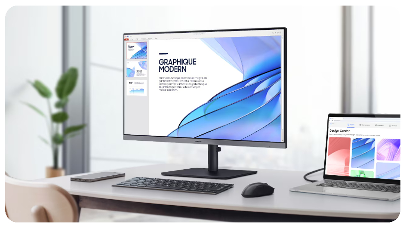 Postaw na technologię, która wspiera Twój rytm pracy. Samsung Essential S4 S43UF to monitor stworzony z myślą o nowoczesnym miejscu pracy – wyposażony w szeroką gamę portów i inteligentne rozwiązania, które gwarantują maksymalną funkcjonalność i wygodę. Dzięki złączom HDMI, DisplayPort oraz czterem portom USB 3.2 Gen1 Typ A zyskujesz pełną elastyczność w podłączaniu urządzeń, a port USB-C umożliwia jednoczesne ładowanie, przesyłanie danych i transmisję obrazu, upraszczając Twoje stanowisko pracy i eliminując zbędne przewody. Wbudowany port LAN zapewnia stabilną, przewodową łączność Ethernet, idealną do pracy biurowej i wideokonferencji, natomiast funkcja połączenia szeregowego (Daisy Chain) pozwala na łatwe zestawienie dwóch monitorów i stworzenie rozległej przestrzeni roboczej, która zwiększa produktywność i komfort pracy.