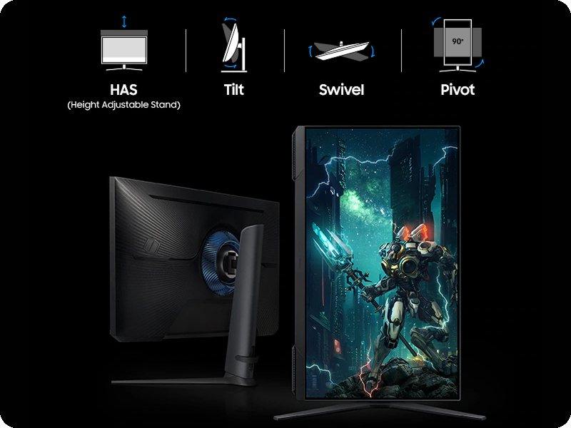 Samsung Odyssey G5 oferuje szeroki zakres regulacji ustawienia ekranu dla maksymalnego komfortu pracy i rozrywki. Użytkownik może dowolnie regulować wysokość, pochylenie oraz kąt obrotu monitora, dopasowując go do swojej postawy. Dzięki funkcji pivot ekran można obrócić do pozycji pionowej, co doskonale sprawdza się przy pracy biurowej czy przeglądaniu dokumentów. To ergonomiczne rozwiązanie zapewnia wygodę przez wiele godzin użytkowania.