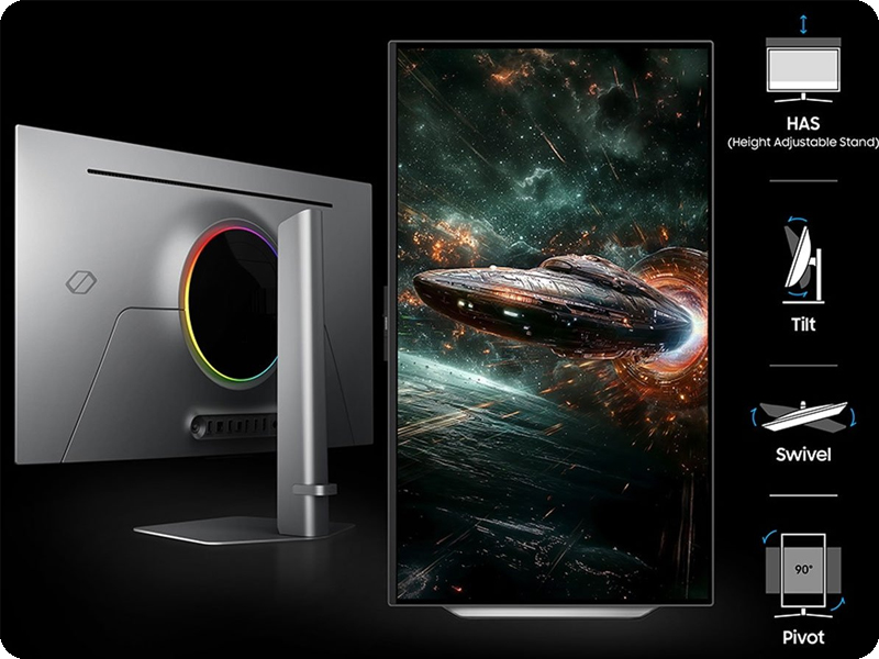Samsung Odyssey G8 oferuje szeroki zakres regulacji ustawienia ekranu dla maksymalnego komfortu pracy i rozrywki. Użytkownik może dowolnie regulować wysokość, pochylenie oraz kąt obrotu monitora, dopasowując go do swojej postawy. Dzięki funkcji pivot ekran można obrócić do pozycji pionowej, co doskonale sprawdza się przy pracy biurowej czy przeglądaniu dokumentów. To ergonomiczne rozwiązanie zapewnia wygodę przez wiele godzin użytkowania.