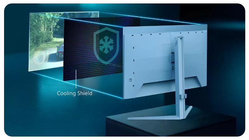 Wypalenie to poważny problem dla użytkowników ekranów QD-OLED. Aby wydłużyć żywotność wyświetlacza, monitor ten ma wbudowaną osłonę z grafenu, która utrzymuje jego niską temperaturę. Grafen równomiernie rozprasza ciepło generowane przez niebieskie światło emitowane przez ekran i chłodzi skuteczniej niż grafit. Dla graczy oznacza to, że mogą grać przy preferowanym poziomie jasności, zmniejszając ryzyko wypalenia ekranu i mogą dłużej cieszyć się idealną jakością obrazu.