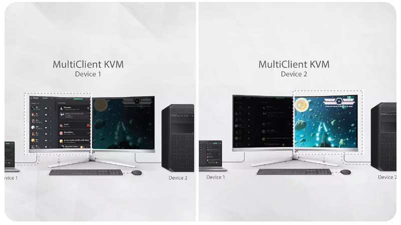 Wbudowany przełącznik KVM umożliwia sterowanie dwoma urządzeniami za pomocą jednej klawiatury i myszy. Funkcja MultiView umożliwia jednoczesne przeglądanie obu źródeł na jednym ekranie. Dzięki tym funkcjom można ograniczyć plątaninę kabli i zaoszczędzić cenny czas. Idealne rozwiązanie dla steamerów z dwoma komputerami, twórców treści lub podczas przygotowywania urządzeń do imprezy LAN.
