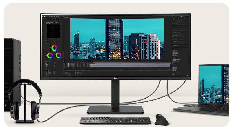 Monitor LG 34BA75QE to idealne rozwiązanie dla nowoczesnego miejsca pracy, w którym liczy się wydajność i porządek. Dzięki szerokiemu zestawowi portów z łatwością podłączysz wszystkie niezbędne urządzenia, eliminując problem ograniczonej łączności. Port USB Type-C™ umożliwia przesył obrazu, danych oraz ładowanie urządzeń z mocą do 90 W – wszystko za pomocą jednego przewodu. Zapomnij o plątaninie kabli i ciesz się czystym, efektywnym stanowiskiem pracy, które wspiera Twój rytm działania.