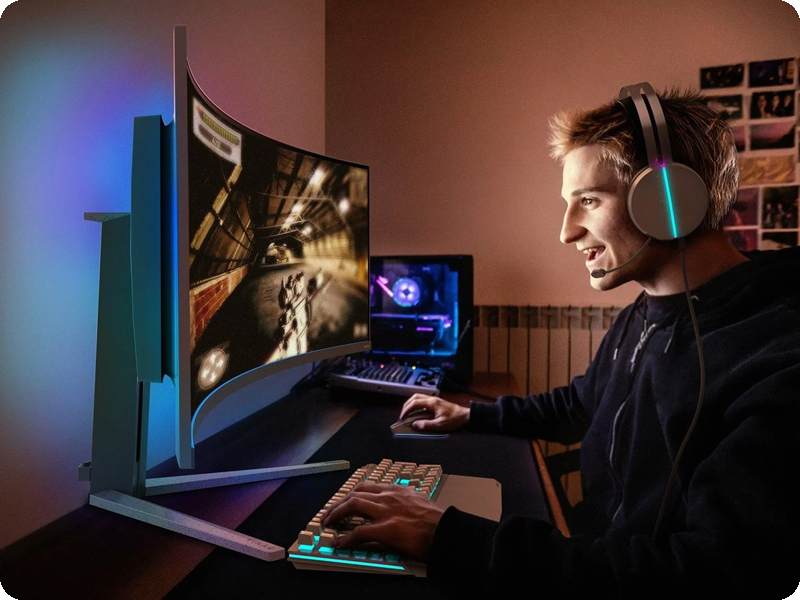 Zaokrąglona konstrukcja ogromnego 49-calowego ekranu otacza użytkownika wrażeniem pełnego zanurzenia. Subtelne, ale głębokie wygięcie zwiększa immersję zarówno podczas grania, jak i oglądania filmów. Prawdziwa 10-bitowa głębia koloru tworzy naturalne przejścia tonalne i płynne gradienty. Certyfikat DisplayHDR True Black 400 gwarantuje wyjątkową detaliczność w cieniach i niesamowitą głębię czerni. Każda scena prezentuje się bardziej realistycznie, intensywnie i pełniej niż na tradycyjnych monitorach.