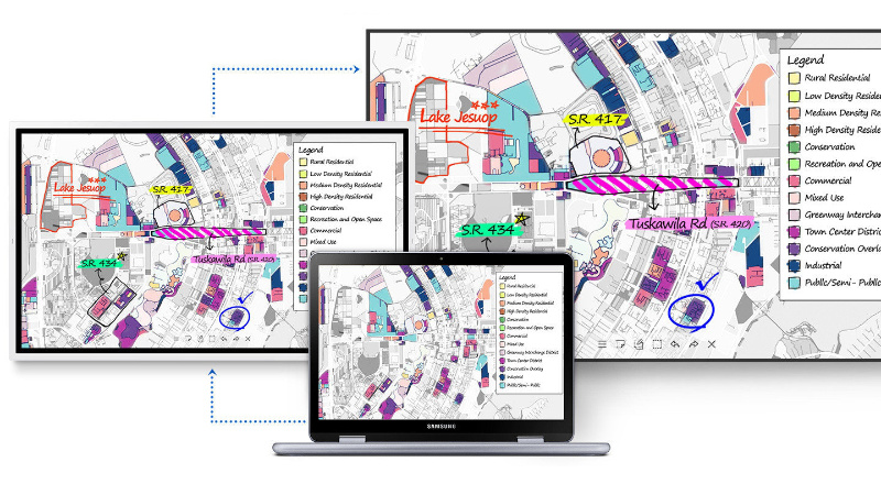 Możesz w czasie rzeczywistym przesyłać treści widoczne na Samsung Flip 2 na inny duży wyświetlacz, korzystając z sieci Wi-Fi lub wyjścia HDMI. Ekran Flip 2 można udostępniać, nawet, gdy tablica podłączona jest do urządzenia osobistego. Funkcja ta doskonale sprawdzi się podczas dużych spotkań czy konferencji, pozwalając przekazać informacje większej publiczności.