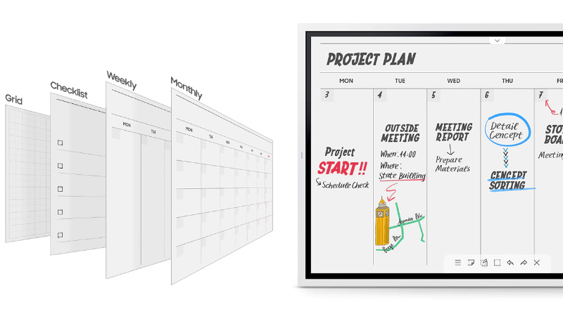 Dzięki wbudowanym, wszechstronnym szablonom Samsung Flip 2 znacząco ułatwi codzienną pracę. Wiele możliwości personalizacji doskonale sprawdzi się w Twoim biznesie. Możesz na nim stworzyć kalendarz, harmonogram działań, notatnik, tablicę do odznaczania zrealizowanych zadań bądź wgrać dowolny szablon.