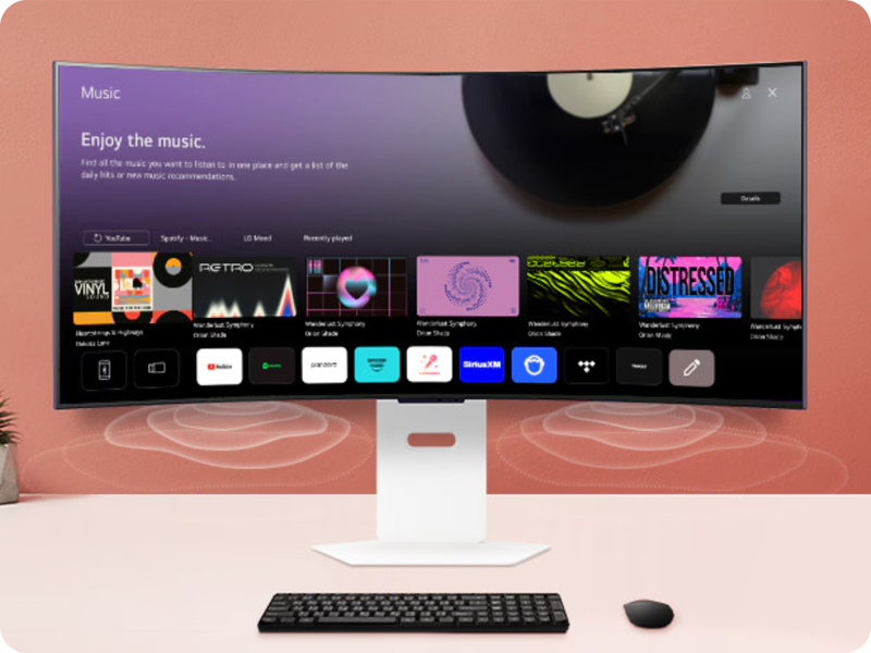 Głośniki stereo o mocy 7 W x 2 pozwalają cieszyć się indywidualnie dopasowaną muzyką. Możesz łatwo wyszukiwać utwory i szybko uzyskać dostęp do ostatnio odtwarzanych tytułów z usług streamingowych, a także otrzymywać rekomendacje popularnych utworów na podstawie Twoich preferencji. Dodatkowo monitor wyposażony jest w technologię AI Sound. Funkcja ta rozpoznaje przestrzeń i dostarcza idealnie dostrojony dźwięk poprzez konfigurację 9.1-kanałową, wskazując lokalizacje dźwięku w celu uzyskania przewagi taktycznej bez konieczności stosowania dodatkowych głośników lub zestawów słuchawkowych. Ponadto technologia ta odróżnia głos gracza od dźwięków otoczenia, dostosowując poziomy głosu i wyrazistość dźwięku, abyś mógł skupić się na grze.