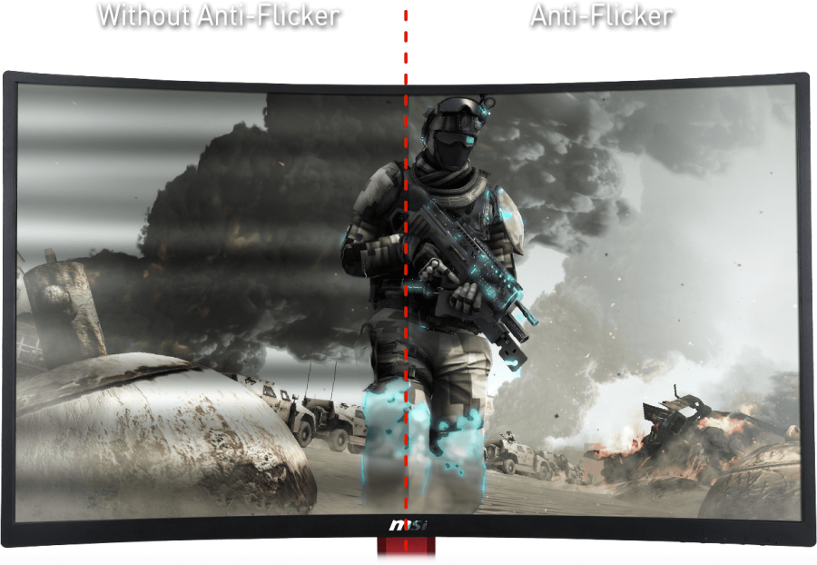 Ekran standardowego monitora podczas normalnej pracy migocze z szybkością około 200 razy na sekundę. To migotanie pod dłuższym czasie powoduje zmęczenie oczu. Ograniczająca migotanie wyświetlacza technologia MSI Anti-Flicker zapewnia użytkownikom znacznie większy komfort korzystania z monitora. Dzięki temu można go używać przez dłuższy czas bez nadwyrężania wzroku.