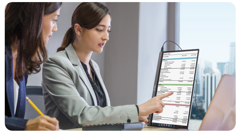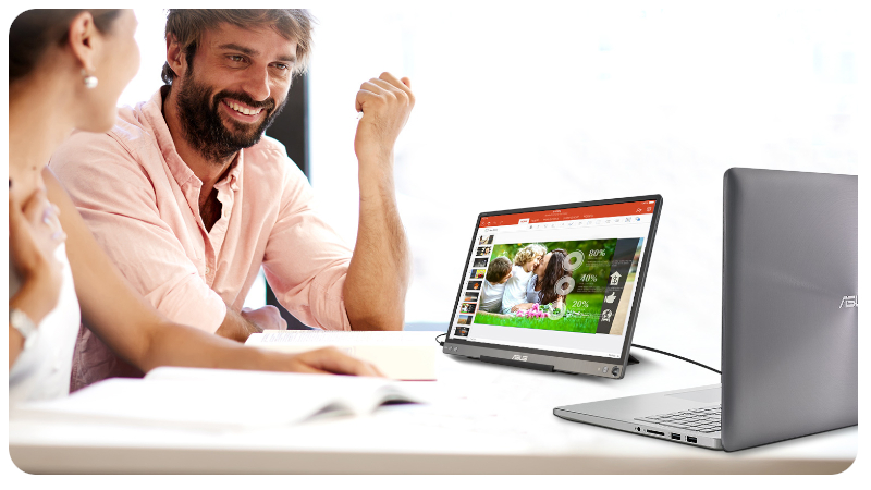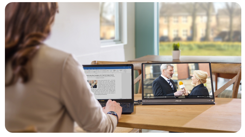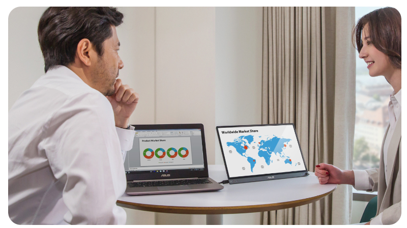 ZenScreen™ MB16ACE doskonale nadaje się do wykorzystania jako drugi monitor do dwuekranowych prezentacji, a jego wszechstronność znacznie zwiększy Twoją wydajność w podróży. Jest niewiarygodnie lekki, ważąc jedynie 0,71 kg, a ponadto wyróżnia się ultrasmukłym, 8-milimetrowym profilem, dzięki czemu zmieści się do każdej torby podróżnej. Za pomocą oprogramowania DisplayWidget* monitor ZenScreen™ MB16ACE jest w stanie automatycznie rozpoznać swoją aktualną orientację i odpowiednio przełączać pomiędzy trybami poziomym i pionowym. Tryb orientacji poziomej doskonale nadaje się do prezentacji oraz wyświetlania arkuszy Excela, podczas gdy tryb orientacji pionowej świetnie sprawdzi się do takich treści jak kod źródłowy aplikacji, dokumenty, książki lub mobilne wersje witryn internetowych.