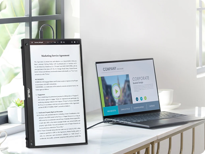 Monitor ASUS ZenScreen MB16AHG jest wyposażony w czujnik G, który automatycznie wykrywa orientację i przełącza pomiędzy trybem poziomym a pionowym obrazu, kiedy monitor jest podłączony do urządzenia mobilnego. Tryb poziomy doskonale nadaje się do prezentacji oraz wyświetlania arkuszy kalkulacyjnych, natomiast tryb pionowy jest idealny do takich treści jak dokumenty, książki lub strony internetowe.