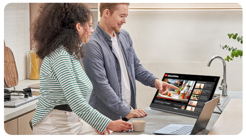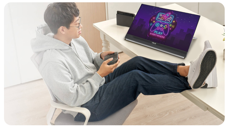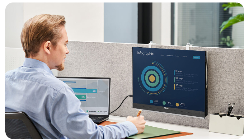 ASUS ZenScreen MB229CF to większy niż standardowe monitory przenośne ekran, który oferuje aż 22 cale przestrzeni roboczej w jakości Full HD. Bezramkowy panel IPS zapewnia zachwycający obraz o szerokich kątach widzenia 178°, dzięki czemu treści prezentują się doskonale niezależnie od perspektywy. Matowa powłoka ekranu eliminuje odbicia i refleksy, pozwalając wygodnie pracować nawet przy oknie czy w jasnym pomieszczeniu. Dzięki lekkiej konstrukcji (2,2 kg) oraz praktycznemu uchwytowi do przenoszenia ZenScreen MB229CF idealnie sprawdza się w trybie hot-desk – w kilka chwil zmienisz dowolne miejsce w komfortowe i w pełni funkcjonalne stanowisko pracy.