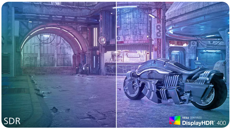 Certyfikat VESA DisplayHDR 400 to technologia gwarantująca zupełnie nową jakość oglądania w porównaniu ze standardowymi monitorami SDR. W odróżnieniu od innych monitorów „zgodnych z technologią HDR”, prawdziwe wyświetlacze z certyfikatem DisplayHDR 400 zapewniają zadziwiającą jasność, niezrównany kontrast i zniewalające kolory. Dzięki funkcji globalnego przyciemniania i minimalnej jasności sięgającej 400 nitów obraz ożywa — jasne kolory są o wiele jaśniejsze, a ciemne jeszcze głębsze i bardziej zniuansowane. Pełniejsza paleta nowych, żywych barw sprawia, że oglądanie staje się inspirującym przeżyciem angażującym zmysły.