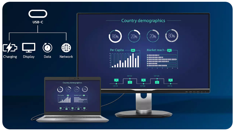 Uproszczenie połączenia wszystkich urządzeń peryferyjnych z komputerem za pomocą jednego złącza USB typu C i jednego kabla, obejmuje połączenie sieciowe, wyjście wideo o wysokiej rozdzielczości z komputera do monitora oraz surfowanie po Internecie bez dodatkowych kabli sieciowych, a nawet bez portu LAN w notebooku. Połączenie RJ45 przez USB-C oferuje szybkie i bezpieczne połączenie w razie potrzeby. Uzyskanie większych prędkości przesyłania danych pozwala na ich najszybszy dotąd transfer z dysku twardego do komputera. Ponadto USB-C z funkcją zasilania może nawet pozwolić na zasilanie notebooka z monitora, eliminując konieczność dodatkowych przewodów zasilających.