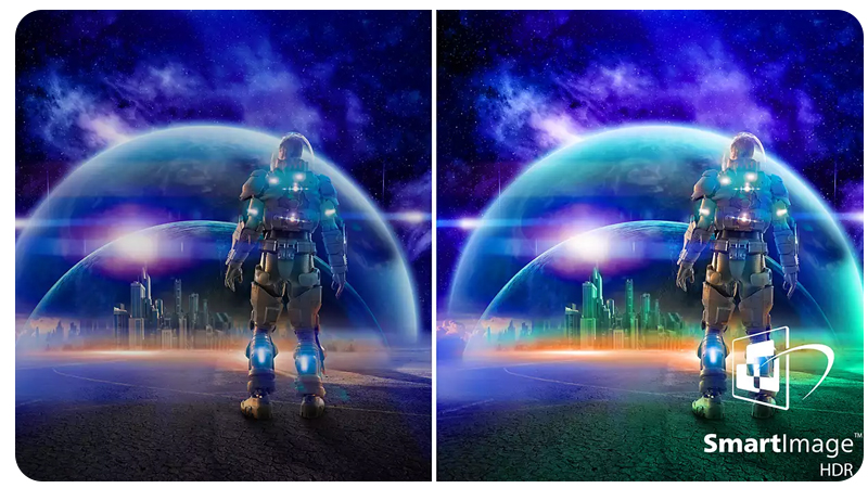 Wybierz jeden z trybów SmartImage HDR, który najlepiej odpowiada Twoim potrzebom. Gry w HDR: optymalizacja pod kątem gier wideo. Dzięki jaśniejszej bieli i ciemniejszej czerni sceny w grach są wyraźne i ujawniają więcej szczegółów. Łatwo dostrzec wrogów ukrywających się w ciemnych zakamarkach i cieniach. Film w HDR: idealny do oglądania filmów w HDR. Zapewnia lepszy kontrast i jasność, co z kolei zapewnia bardziej realistyczne wrażenia i uczucie zanurzenia podczas oglądania. Zdjęcia w HDR: lepsze kolory: czerwony, zielony i niebieski dla wyraźnych efektów wizualnych. DisplayHDR: certyfikat VESA DisplayHDR*. Ustawienia osobiste: umożliwiają dostosowanie ustawień w menu obrazu.
