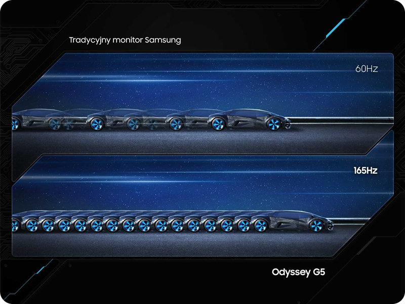 Monitor Odyssey G5 charakteryzuje się częstotliwością odświeżania wynoszącą 165 Hz oraz 1-milisekundowym czasem odpowiedzi matrycy. Dzięki tym parametrom może zaoferować istotne korzyści w grach, które zawierają szybkie, dynamiczne sceny, a więc w tytułach z gatunku FPS (First Person Shooter), wszelkiego rodzaju „bijatykach”, symulacjach wyścigów samochodowych, strategiach czasu rzeczywistego czy w grach sportowych. Gry te wymagają odwzorowania bardzo szybkich i precyzyjnych ruchów na ekranie, które to zapewnić mogą jedynie wyjątkowo wysokie częstotliwości odświeżania ekranu oraz niskie czasy reakcji matrycy monitora. To właśnie dzięki nim, gracz może podczas rozgrywki z łatwością pokonać swoich przeciwników.