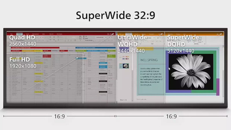 49-calowy monitor SuperWide 32:9 o rozdzielczości 5120 x 1440 został zaprojektowany z myślą o zastąpieniu zestawów złożonych z kilku monitorów i zapewnieniu niezwykle szerokiego obrazu. To tak, jakby mieć na biurku ustawione dwa 27-calowe monitory Quad HD 16:9. Monitor SuperWide dorównuje obszarem wyświetlania dwóm monitorom bez konieczności konfigurowania skomplikowanych ustawień.