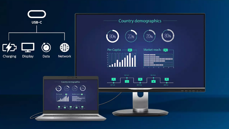 Ten monitor Philips ma wbudowaną stację dokującą USB typu C z funkcją zasilania. Smukłe, dwustronne złącze USB-C umożliwia łatwe dokowanie z użyciem jednego przewodu. Dzięki niemu możesz podłączyć wszystkie urządzenia peryferyjne, np. klawiaturę, mysz i przewód Ethernet RJ-45 do stacji dokującej monitora. Wystarczy podłączyć ten monitor do notebooka za pomocą pojedynczego kabla USB-C, aby oglądać filmy wideo o wysokiej rozdzielczości oraz szybko przesyłać dane i jednocześnie zasilać lub ładować notebooka.