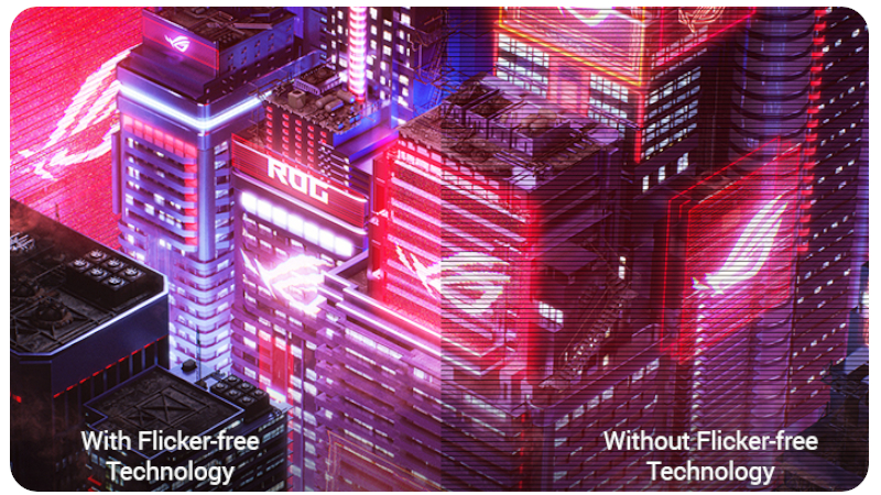 Monitor ROG Strix XG49VQ jest wyposażony w certyfikowany przez TÜV Rheinland filtr ASUS Ultra-Low Blue Light, który chroni wzrok użytkownika i zapobiega zmęczeniu oczu na skutek szkodliwego działania niebieskiego światła. Cztery różne ustawienia filtra możesz wybierać za pośrednictwem menu ekranowego, czy też korzystając z pięciodrożnego joysticka. Dodatkowo ROG Strix XG49VQ redukuje migotanie ekranu, minimalizując zmęczenie oczu i zapewniając bardziej komfortowe wrażenia gamingowe.