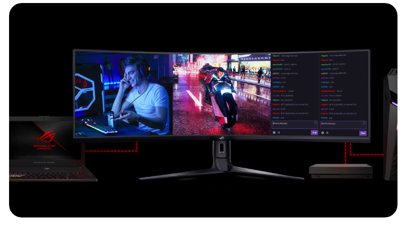 Dysponując ekranem super ultra-wide z obsługą wielu źródeł sygnału oraz technologii „obraz po obrazie”, monitor ROG Strix XG49VQ umożliwia Ci oglądanie treści z nawet trzech różnych źródeł sygnału w tym samym czasie. Możesz więc cieszyć się lepszymi wrażeniami z rozgrywki, np. grając na konsoli Xbox One lub PS4 Pro, a jednocześnie oglądać transmisje na żywo w serwisie Twitch za pośrednictwem swojego komputera. Dodatkowo dzięki dostępności wygodnych skrótów klawiszowych monitor ROG Strix XG49VQ umożliwia Ci szybkie i łatwe wyświetlanie obok siebie obrazu wideo z różnych źródeł, jak również ręczne dostosowywanie rozmieszczenia dla najlepszego możliwego dopasowania na powierzchni ekranu.
