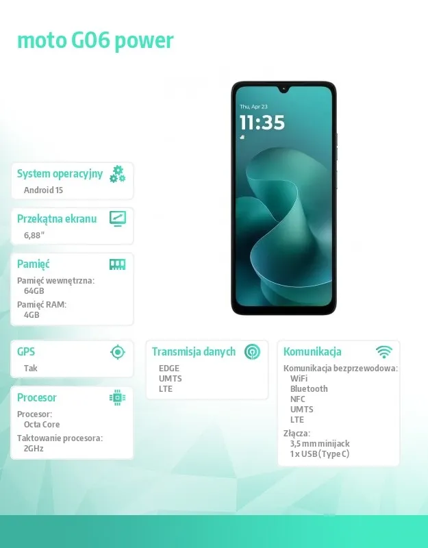 Pozostań pełen energii w pracy, zabawie i we wszystkim pomiędzy dzięki baterii 7000 mAh, zapewniającej do 65 godzin działania, największej w tej klasie urządzeń. Oglądaj strumieniowo na jasnym ekranie 6,88 cala, korzystaj z głośników stereofonicznych z technologią Dolby Atmos, rejestruj wszystko za pomocą aparatu 50 Mpx wspieranego przez sztuczną inteligencję i udoskonal wielozadaniowość dzięki maksymalnie 12 GB pamięci RAM przy użyciu funkcji RAM Boost. Potrzebujesz szybkich odpowiedzi? Korzystając z funkcji Circle to Search, można natychmiast wyszukiwać informacje dotyczące obiektów widocznych na ekranie. Cała ta moc jest zawarta w wykończeniu premium o miękkiej, luksusowej teksturze i trwałej obudowie smartfonu moto g06 power posiadającym stopień IP64.