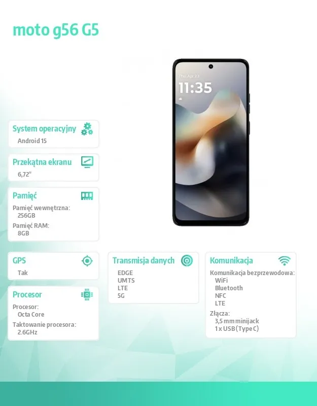 Nowy moto g56 5G business edition łączy w sobie elegancki i profesjonalny styl z wytrzymałością standardu militarnego.