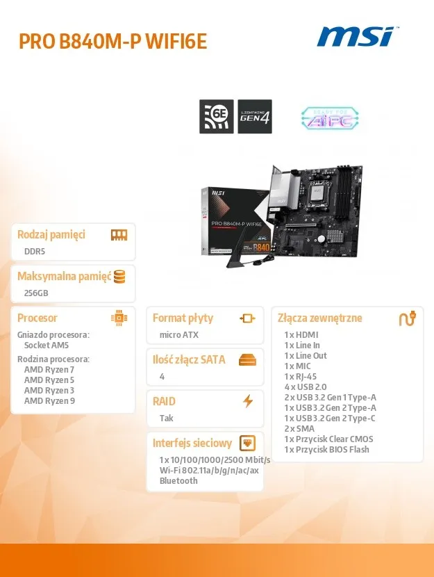 MSI Płyta główna PRO B840M-P WIFI6E AM5 4DDR5 ATX