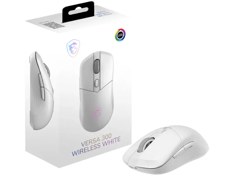 VERSA 300 WIRELESS WHITE to lekka, ważąca 60 g mysz przeznaczona dla graczy i profesjonalistów. Oferuje ona szereg elastycznych możliwości podłączenia jej do komputera, w tym w bezprzewodowym trybie MSI SWIFTSPEED 2.4G, przy wykorzystaniu standardu Bluetooth oraz przewodowego połączenia USB. Myszkę wyposażono w precyzyjny czujnik optyczny o rozdzielczości do 8000 DPI, który zapewnia dokładne śledzenie ruchów i wyjątkową szybkość reakcji. Do jej budowy zastosowano też wyjątkowo trwałe mikroprzełączniki o żywotności ponad 30 milionów kliknięć. Urządzenie pochwalić też się może konfigurowalnym podświetleniem RGB.