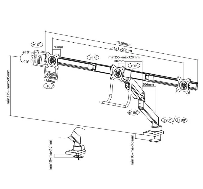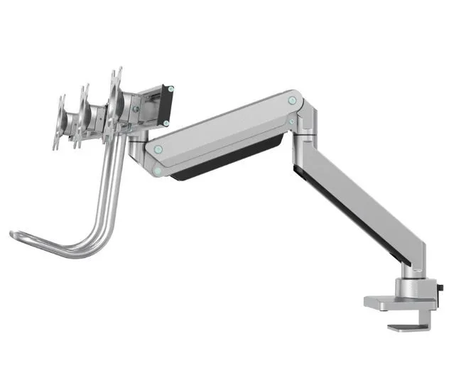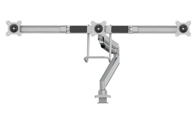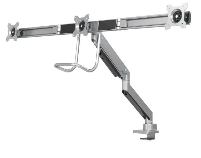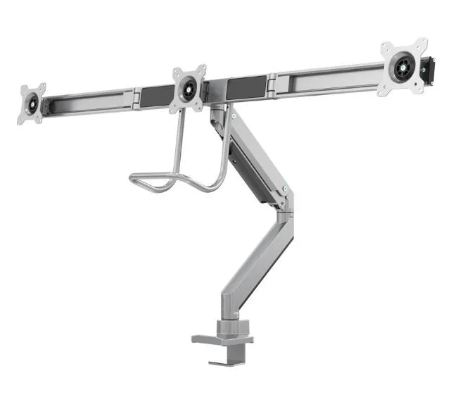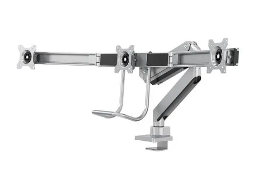 NewStar NM-D775DX3SILVER to uchylny, obrotowy i obrotowy uchwyt biurkowy z poprzeczką i uchwytem do trzech płaskich ekranów o przekątnej do 24 ". Uchwyt ten jest doskonałym wyborem do umieszczania na biurku za pomocą zacisku biurkowego lub uchwytu przelotki. Za pomocą płytek adaptera NewStar VESA można zakryć różne wzory otworów. Idealny do stosowania w biurach, na ladach lub w recepcji.