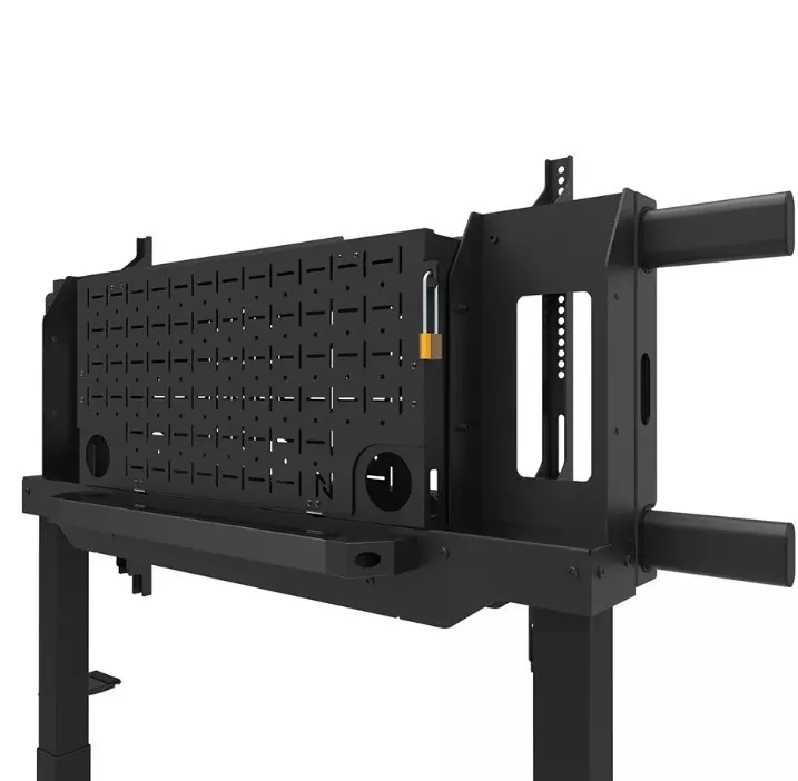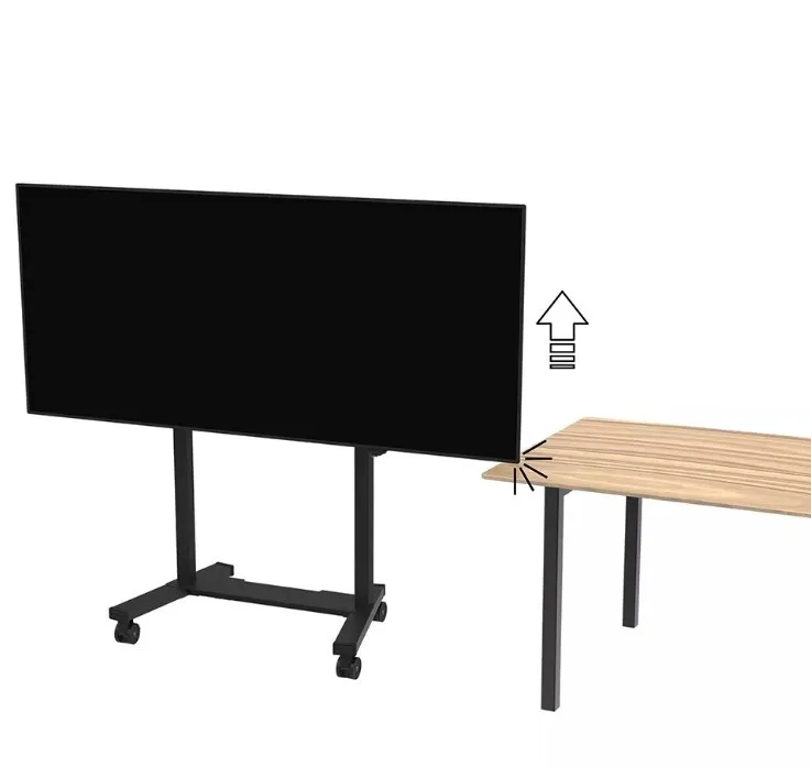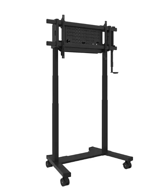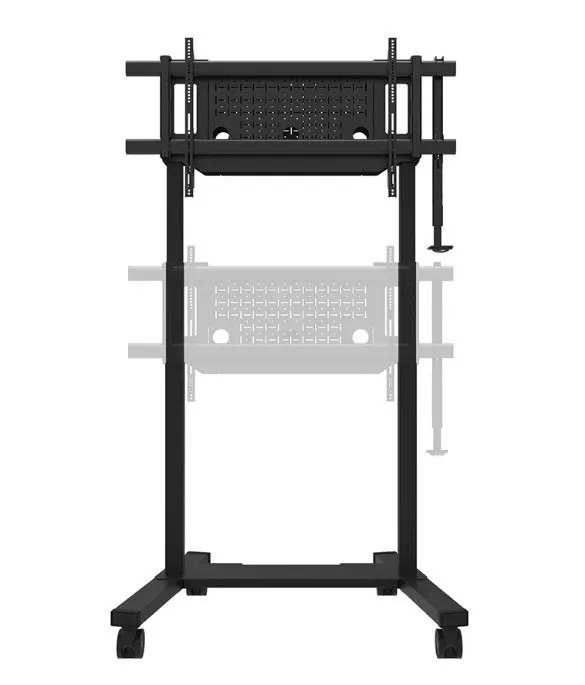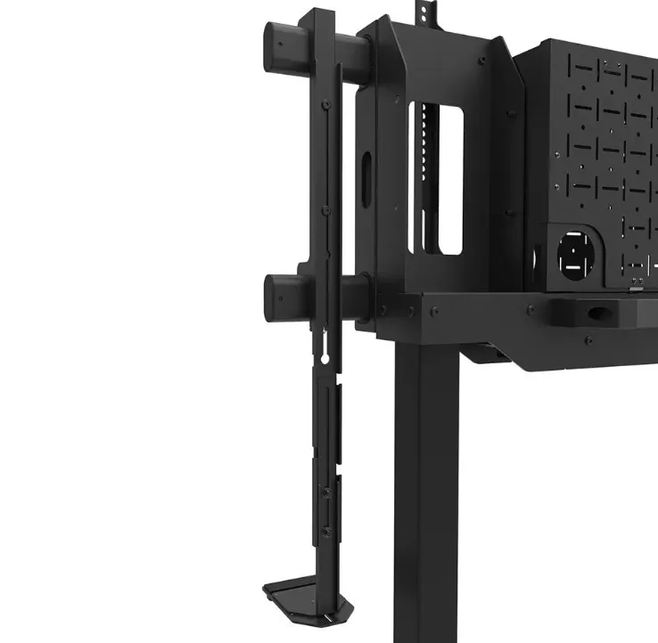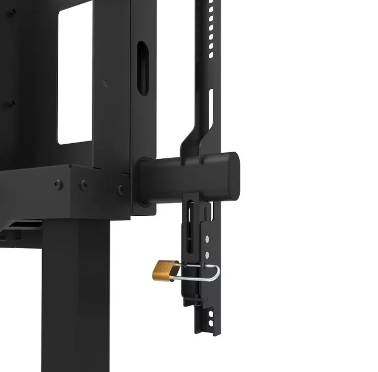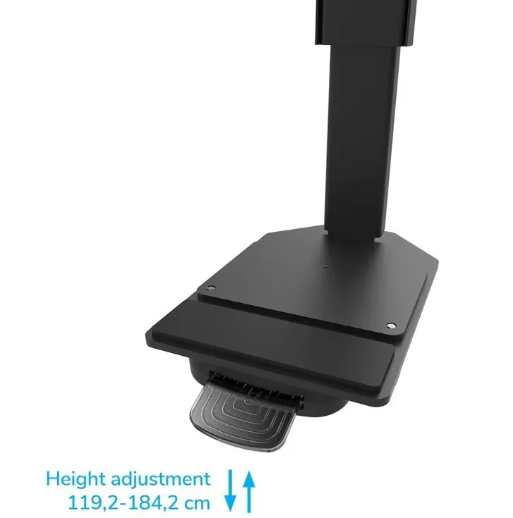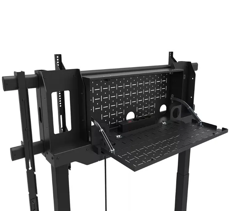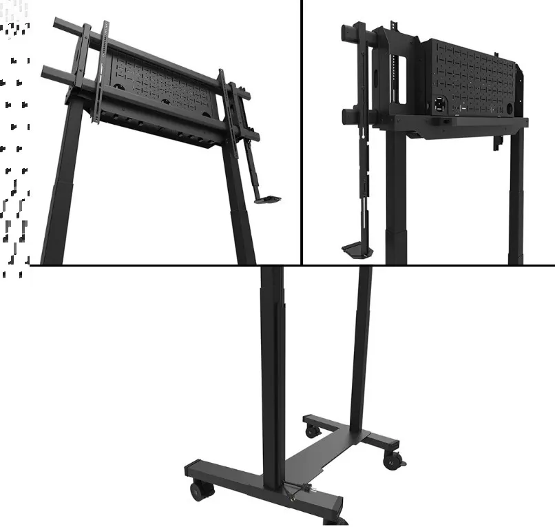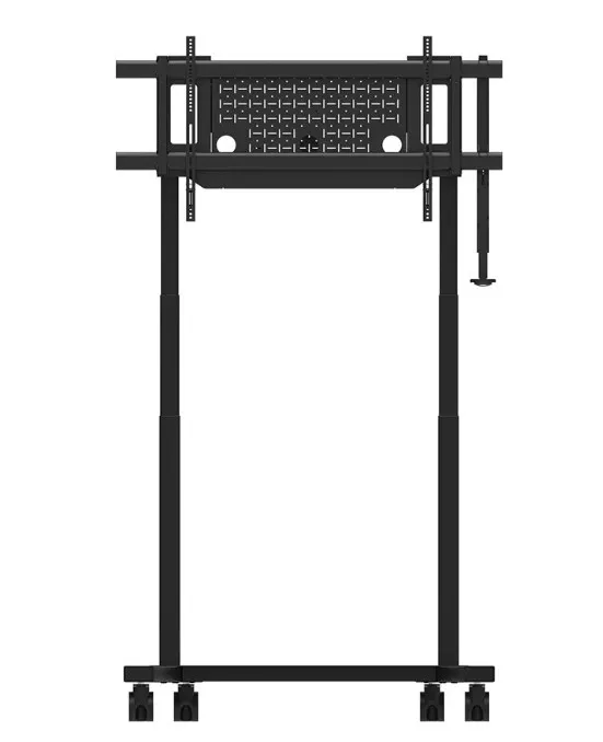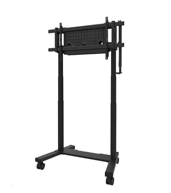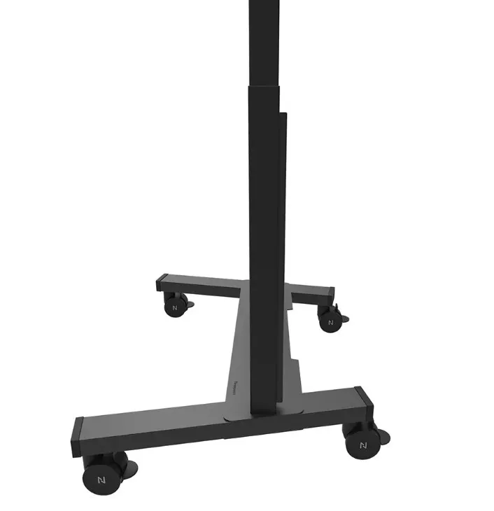 Neomounts FL55-975BL1 MOVE Lift XL to idealny zmotoryzowany wózek do dużych wyświetlaczy do 115" i 160 kg. Solidna stojaka oferuje 65 cm mechanicznej regulacji wysokości, co pozwala na prezentacje zarówno na siedzącą, jak i stojącą na idealnej wysokości widzenia oraz podnosi ekran ponad publiczność. Działanie jest płynne i precyzyjne dzięki wygodnie umieszczonemu panelu sterowania. System antykolizjny zapewnia bezpieczną regulację wysokości, a uchwyty można zamknąć kłódką (bez dołączenia) dla dodatkowego bezpieczeństwa. Opcjonalnie wentylowana, zamykana przegródka na osprzęt z otworem na kabel zapewnia czyste i bezpieczne przechowywanie sprzętu.