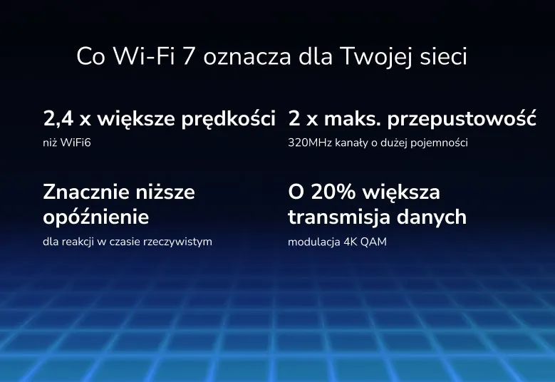 Zapewnia 2,4 razy szybsze prędkości i znacznie mniejsze opóźnienia niż WiFi 6, aby zmaksymalizować wydajność wszystkich urządzeń