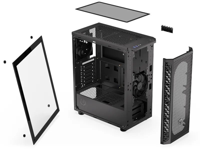 Zdejmowany przedni panel Panel boczny ze szkła hartowanego Filtry antykurzowe System aranżowania kabli Montaż zasilacza na dole obudowy Otwór wspomagający montaż chłodzenia na procesor |