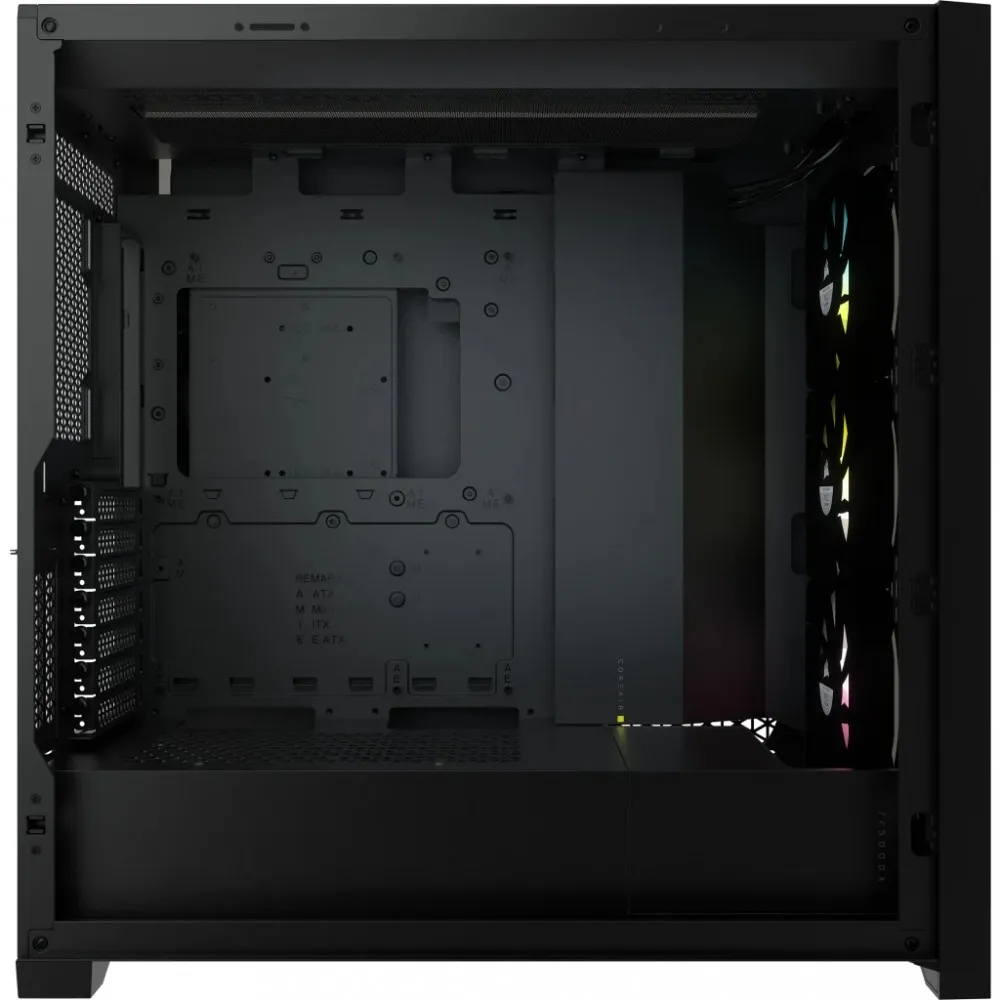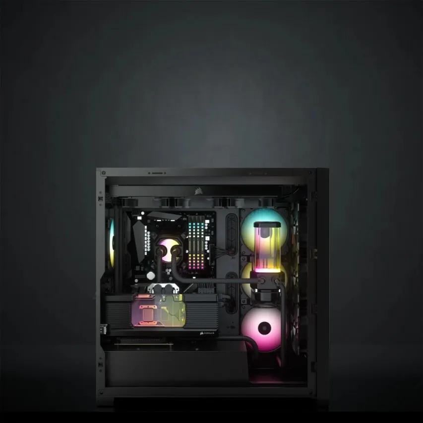 CORSAIR iCUE 5000X RGB to obudowa komputera mid-tower ATX, która eksponuje jego atuty, a nie kable. Cztery efektowne panele z hartowanego szkła oraz trzy dodane w komplecie wentylatory CORSAIR SP RGB ELITE eksponują zalety wnętrza komputera.