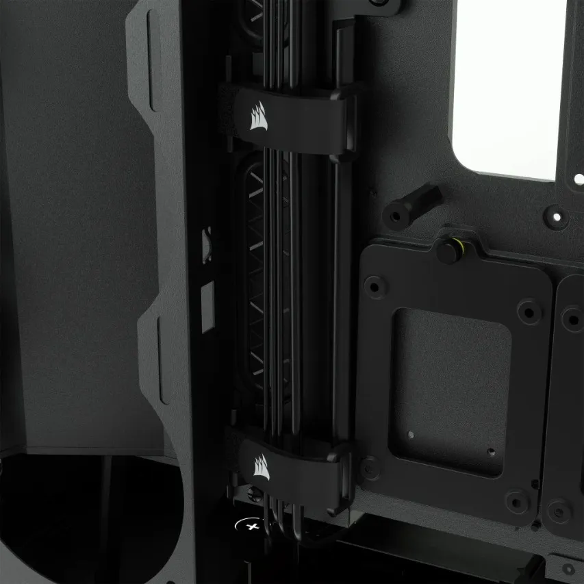 Pionowe gniazda PCIe i mocowanie przedłużacza CORSAIR PCI-Express 3.0 (do nabycia osobno) umożliwiają prezentację, a jednocześnie bezpieczne umiejscowienie karty graficznej.